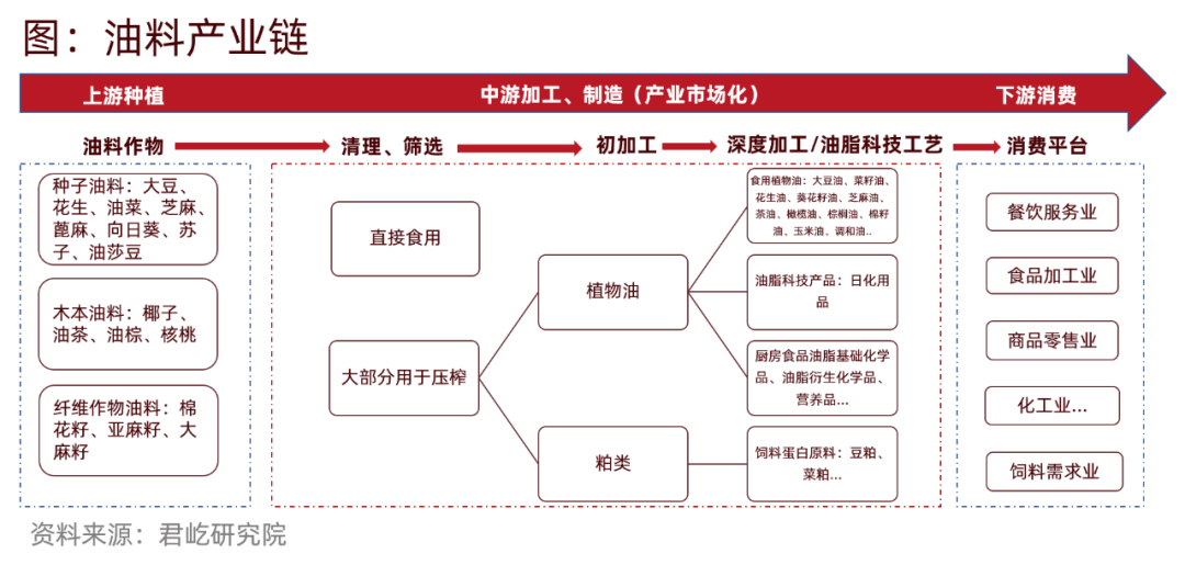 中國油料產(chǎn)業(yè)鏈上游為種植業(yè),生產(chǎn)壓榨油料所需的農作物;中游為植物油加工業(yè),主要包括壓榨、深度加工/油脂科技工藝等主體;下游為具體應用和消費者。