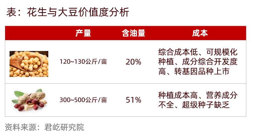 同為油料作物,普通花生的含油量(51%)是大豆(20%)的2.5倍,花生畝產(chǎn)是大豆的2.5~4.2倍,畝產(chǎn)量(300-500公斤)是大豆(120-130公斤)的2.5-4.1倍,其含油量和單畝產(chǎn)量都超過(guò)大豆。