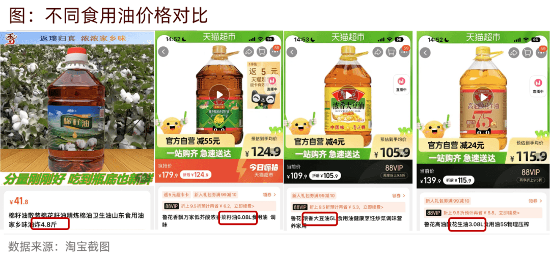 目前,我國前5大食用植物油為豆油(占比48%)、菜籽油 (占比23%)、棕櫚油(占比12%)、花生油(占比9%)和棉籽油 (占比4%)。棕櫚油多用于油炸食品,而四大油料作物榨取的油常用于日常餐飲中。