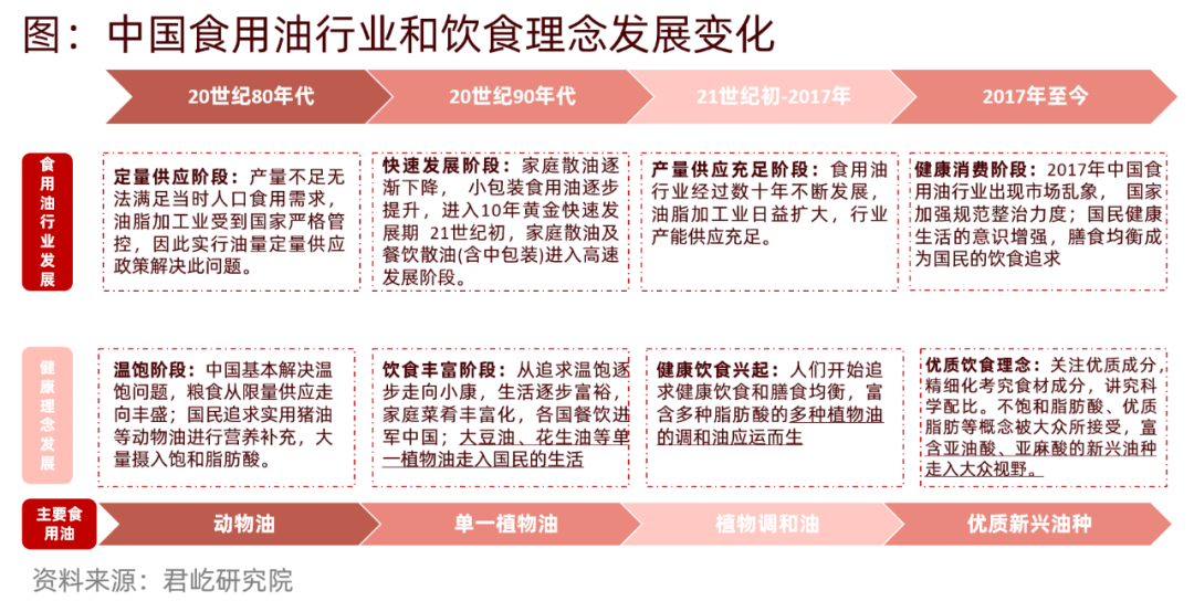 從20世紀80年代起,我國食用油行業(yè)經(jīng)歷了由定量供應到充足供應的高速發(fā)展歷程,消費者主要選擇的食用油,由動(dòng)物油逐步演變到植物油、調和油。近來(lái)年,隨著(zhù)經(jīng)濟水平的提升及健康理念崛起,消費者在選擇食用油時(shí)愈加看重營(yíng)養成分及健康性,也對于油料市場(chǎng)提出了更高的要求。