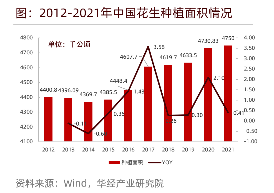 目前中國是全球花生總產(chǎn)量最大的產(chǎn)區,占比37%, 其次為印度、尼日利亞、美國、蘇丹、塞內加爾、阿根廷、印度尼西亞等產(chǎn)區。2021年中國花生種植面積為4750千公頃,同比增長(cháng) 0.41%;種植面積位居第三,僅次于大豆和菜籽。