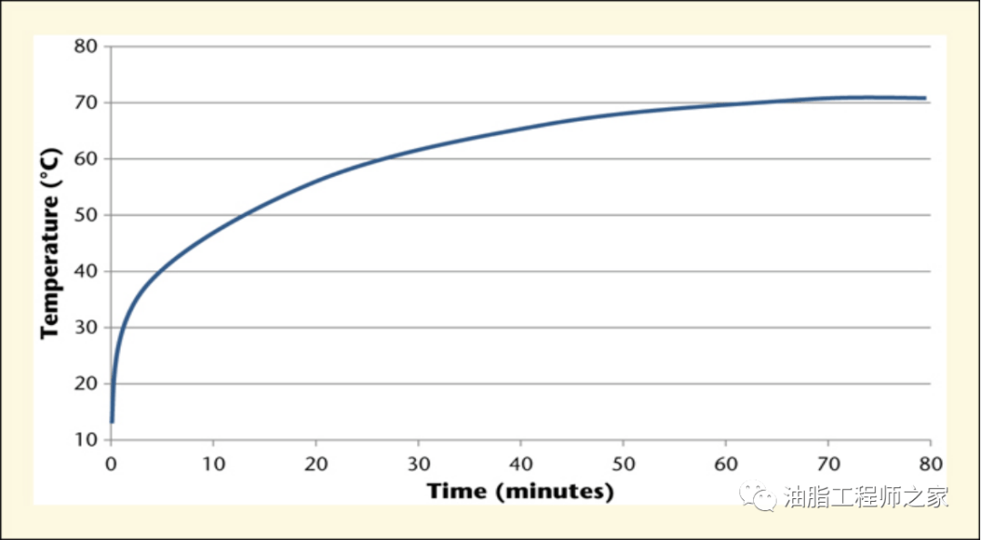 此工序不是必須的,但適用于大多數壓榨過(guò)程。油料在軋坯前預熱至60°C左右的溫度,水分含量沒(méi)有明顯變化。這種預熱提高了種子的可塑性,并易于軋坯時(shí)坯片的成型。它的主要困難在于油菜籽的導熱率較低。根據Timbers(1975),菜籽的導熱率在0.10和0.15Wm?1.°C?1。在實(shí)踐中,這意味著(zhù)菜籽作為一種絕熱材料,導熱率在膠合板(0.11W.m?1.°C?1)和松木(0.15W?1.°C?1)之間。單獨的傳導不能均勻加熱油籽。因此,有必要通過(guò)劇烈攪拌油料來(lái)加強熱傳導,并且需要一個(gè)相當大的換熱面來(lái)進(jìn)行熱交換。例如,圖2描述了用熱電偶在10毫米料位的油菜籽中測量的溫度變化,該表層油籽溫度在72°C時(shí),內部溫度為15°C。結果表明,在距離油籽加熱表面5毫米處,需要半小時(shí)才能達到60°C。