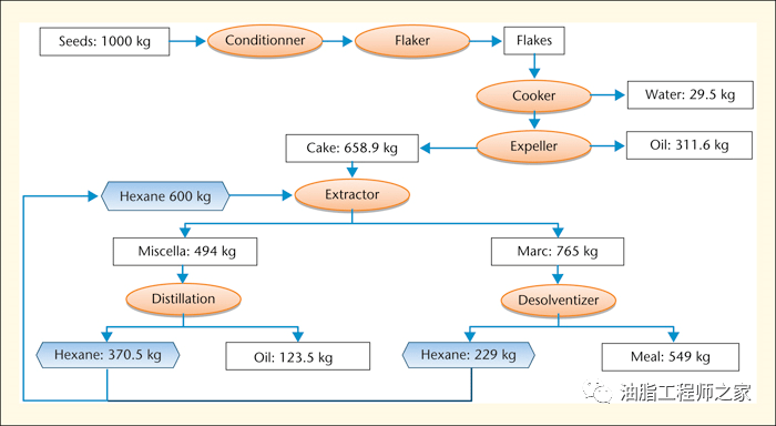 本研究中使用的數據:對于油籽和粕1.9kJ.°C?1kg?1,對油2kJ.°C?1kg?1,正己烷2.27kJ/kg,正己烷氣化潛熱:328kJ/kg,正己烷沸點(diǎn)(69°C )。油料和粕的數據:本研究認為,菜籽的含水量為7.8%,含油量為45.0%。這些值來(lái)源于法國油籽技術(shù)中心在2007-2011年間進(jìn)行的“油菜籽作物質(zhì)量”調查的平均結果。根據法國油籽組織調查(2011年),2011年平均含水量為11.3%,含油量為2.7%(±0.5)(。人們認為預榨餅的油含量為21%。產(chǎn)品流向和物料平衡情況見(jiàn)圖1。