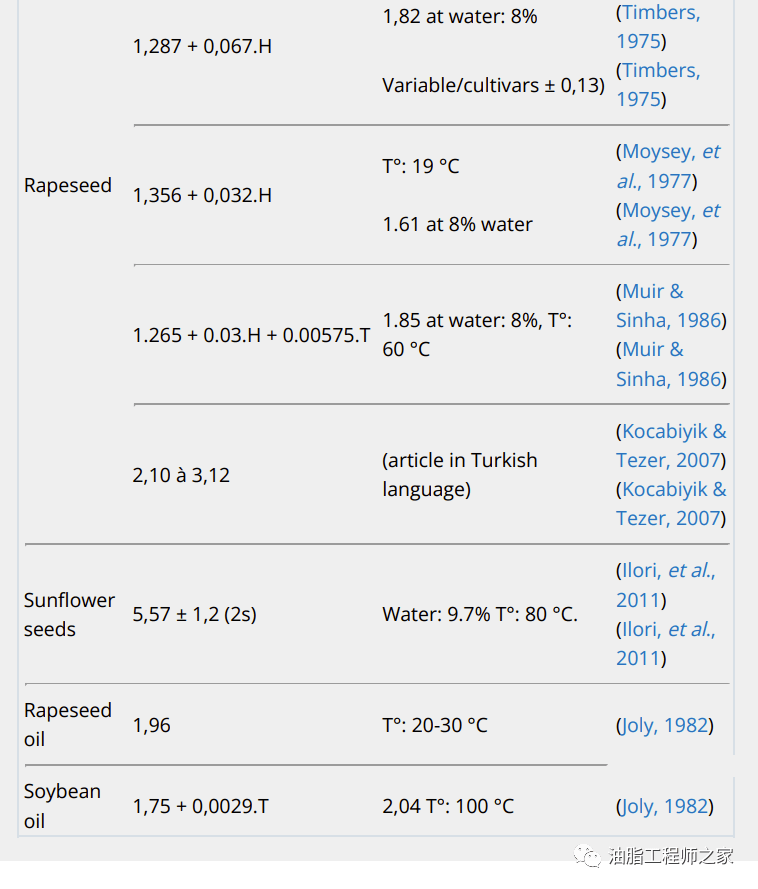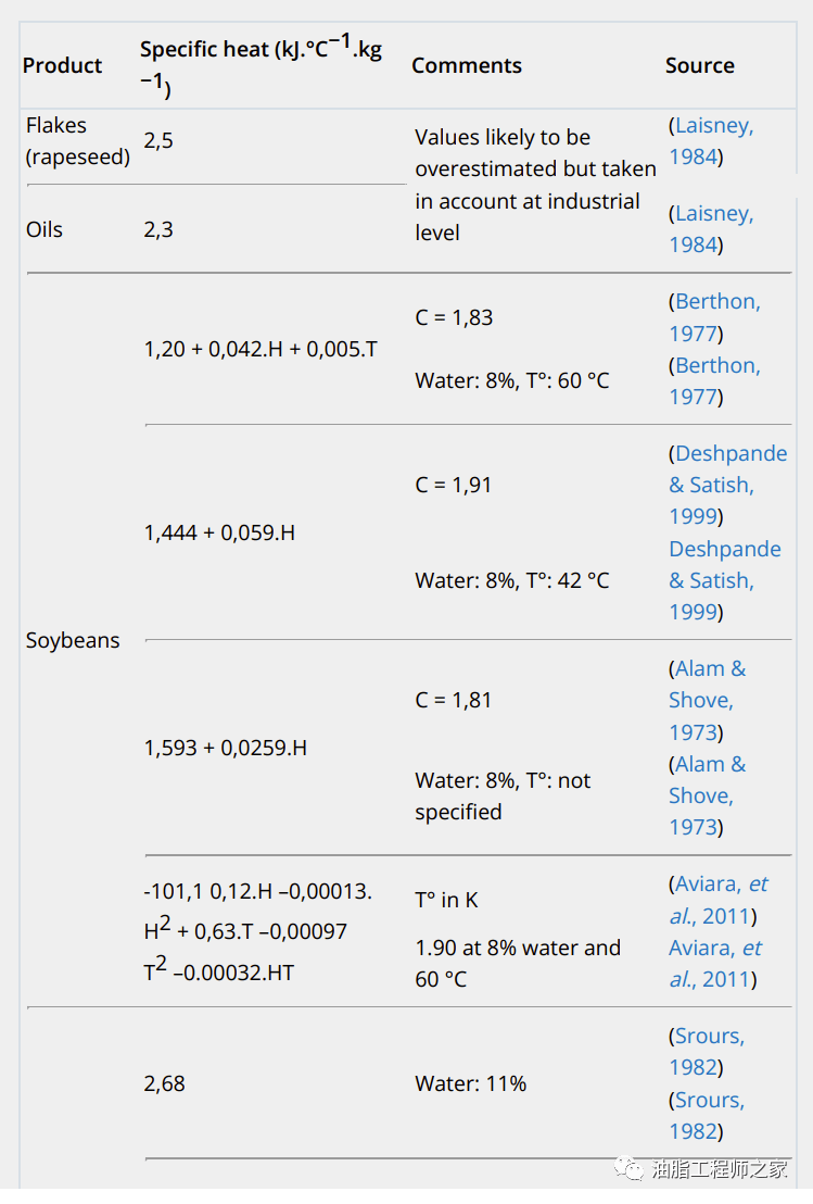 對壓榨不同階段所需的理論熱量的需求評估,必須考慮到油籽、油餅、粕和油的比熱??蓞⒖加玫臄抵低ǔJ抢系牟⑶蚁鄬^少,差異很大。表1顯示了文獻中的一些比熱值。