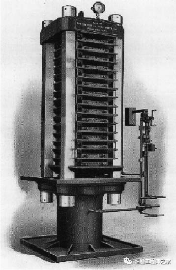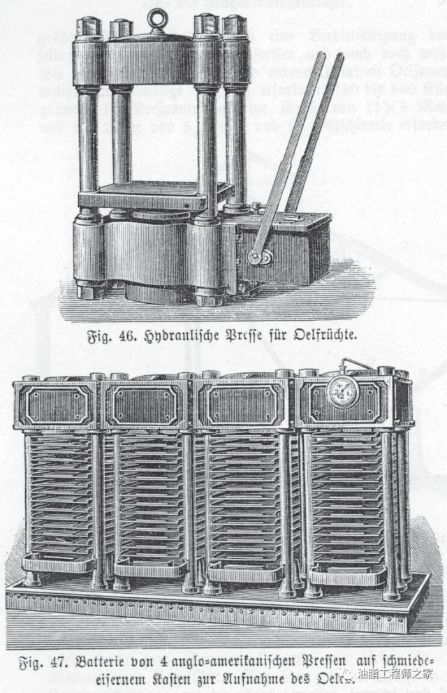 19世紀晚期,德國公司開(kāi)始生產(chǎn)液壓籠式榨油機,依靠活塞將油籽壓入豎直有槽的榨籠中,而不需要濾布。到19世紀末,液壓榨油機已成為油脂界最重要的機械設備。