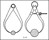 下圖是常見(jiàn)的兩種內外卡鉗。內外卡鉗是最簡(jiǎn)單的比較量具。外卡鉗是用來(lái)測量外徑和平面的,內卡鉗是用來(lái)測量?jì)葟胶桶疾鄣?。它們本身都不能直接讀出測量結果,而是把測量得的長(cháng)度尺寸(直徑也屬于長(cháng)度尺寸),在鋼直尺上進(jìn)行讀數,或在鋼直尺上先取下所需尺寸,再去檢驗零件的直徑是否符合。