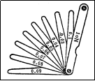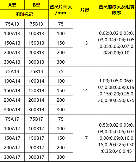 按照塞尺的組別制成一把一把的塞尺,每把塞尺中的每片具有兩個(gè)平行的測量平面,且都有厚度標記,以供組合使用。測量時(shí),根據結合面間隙的大小,用一片或數片重迭在一起塞進(jìn)間隙內。