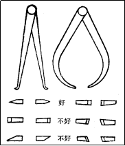 首先檢查鉗口的形狀,鉗口形狀對測量精確性影響很大,應注意經(jīng)常修整鉗口的形狀,下圖所示為卡鉗鉗口形狀好與壞的對比。