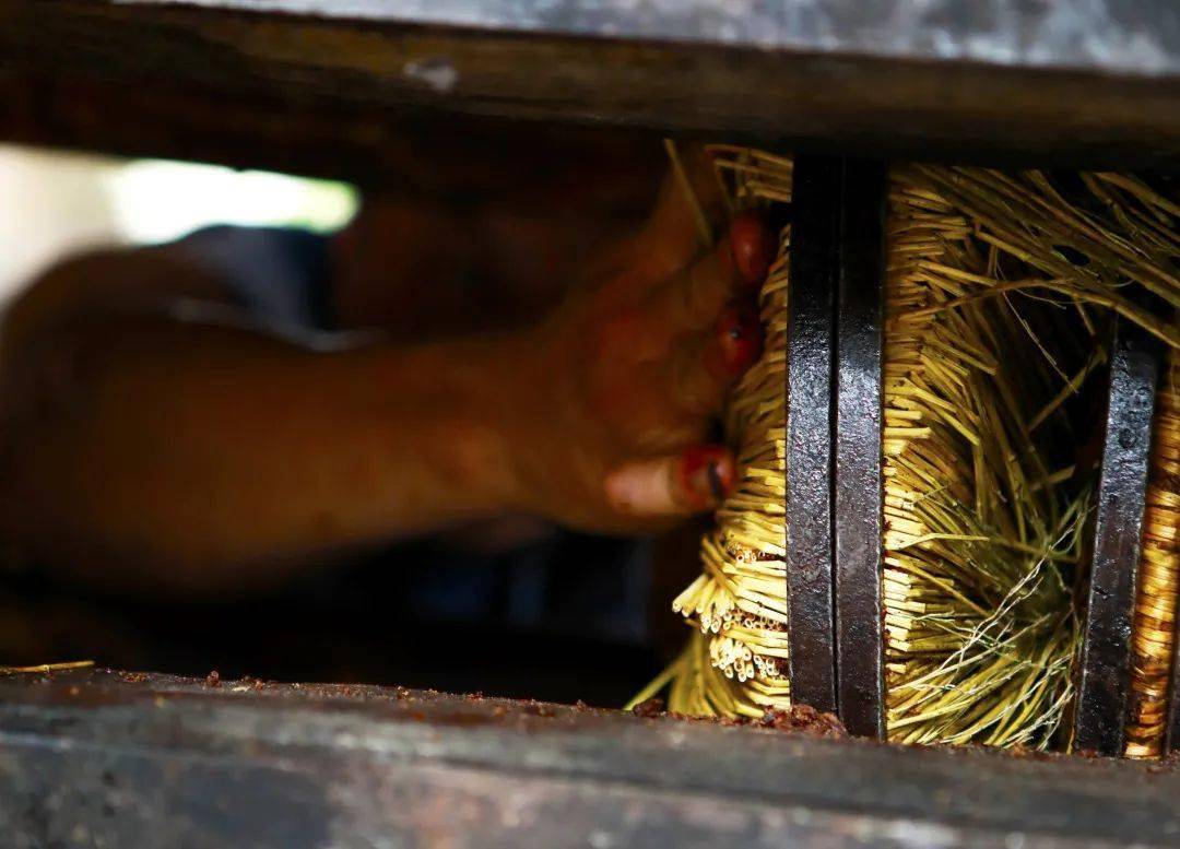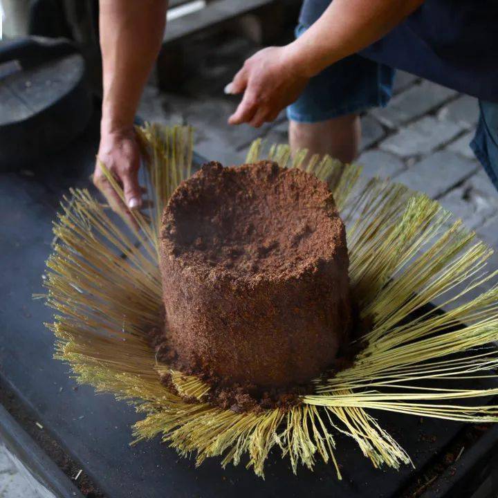 蒸茶粉,茶粉不能熟透,踩枯也叫踩餅,下面鋪上干谷草,師傅講用糯米的桔桿最好,耐用。以前用腳踩現在用手動(dòng)螺旋壓餅機,一是干凈,二是能使油餅壓得緊實(shí)些。