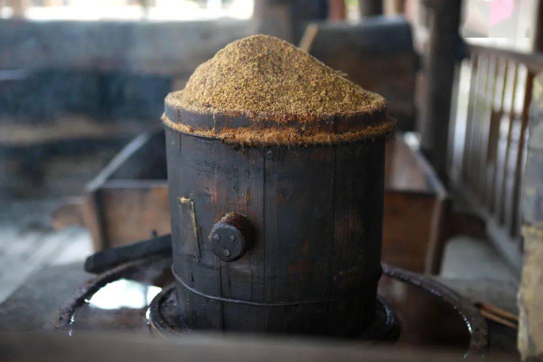 摘好的油茶籽經(jīng)過(guò)晾曬脫殼,被送入油碾,一顆顆茶籽在石槽內被反復碾壓,最終成為一種棕黑色的粉末,透出陣陣植物芳香,茶粉越細越容易出油。