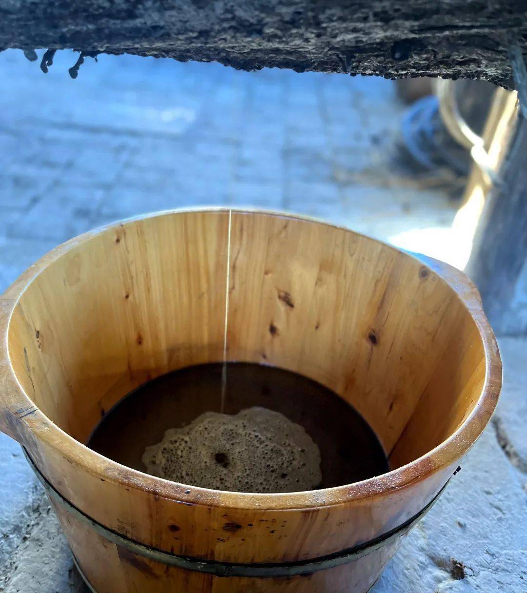 “咚!咚!咚!……”重達上百斤的百年老樟樹(shù)木錘有力地撞擊著(zhù)木楔,發(fā)出一聲聲沉悶的撞擊聲,木頭油槽中的油餅被擠壓后,澄澈透亮、香味濃郁的山茶油就從油槽底部的小孔汩汩流出,撲鼻的醇香漸漸散開(kāi)……